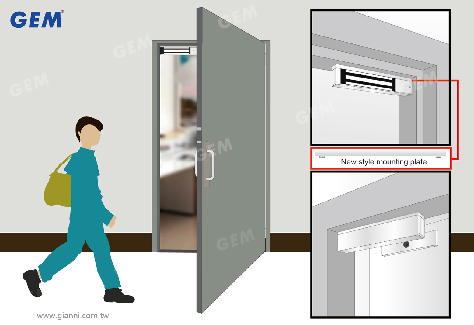 The GEM series electromagnetic locks use a new style mounting plate and patented. The mounting plate is designed with increased thickness for the screw hole at each end to secure the lock body with more stability and strength. The GEM series can be installed on various types of doors or door frames with optional auxiliary mounting brackets.